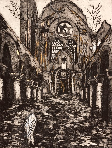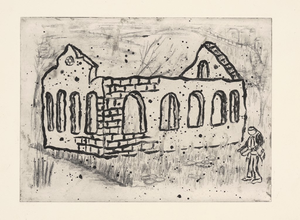 בברלי גיין בתבונה ורגישות רושמת תחילה בעיפרון ולאחר מכן בצריבה על פלטות מתכת לקראת ההדפס, את בית הכנסת על מצבם הנוכחי ההרוס והשבור.