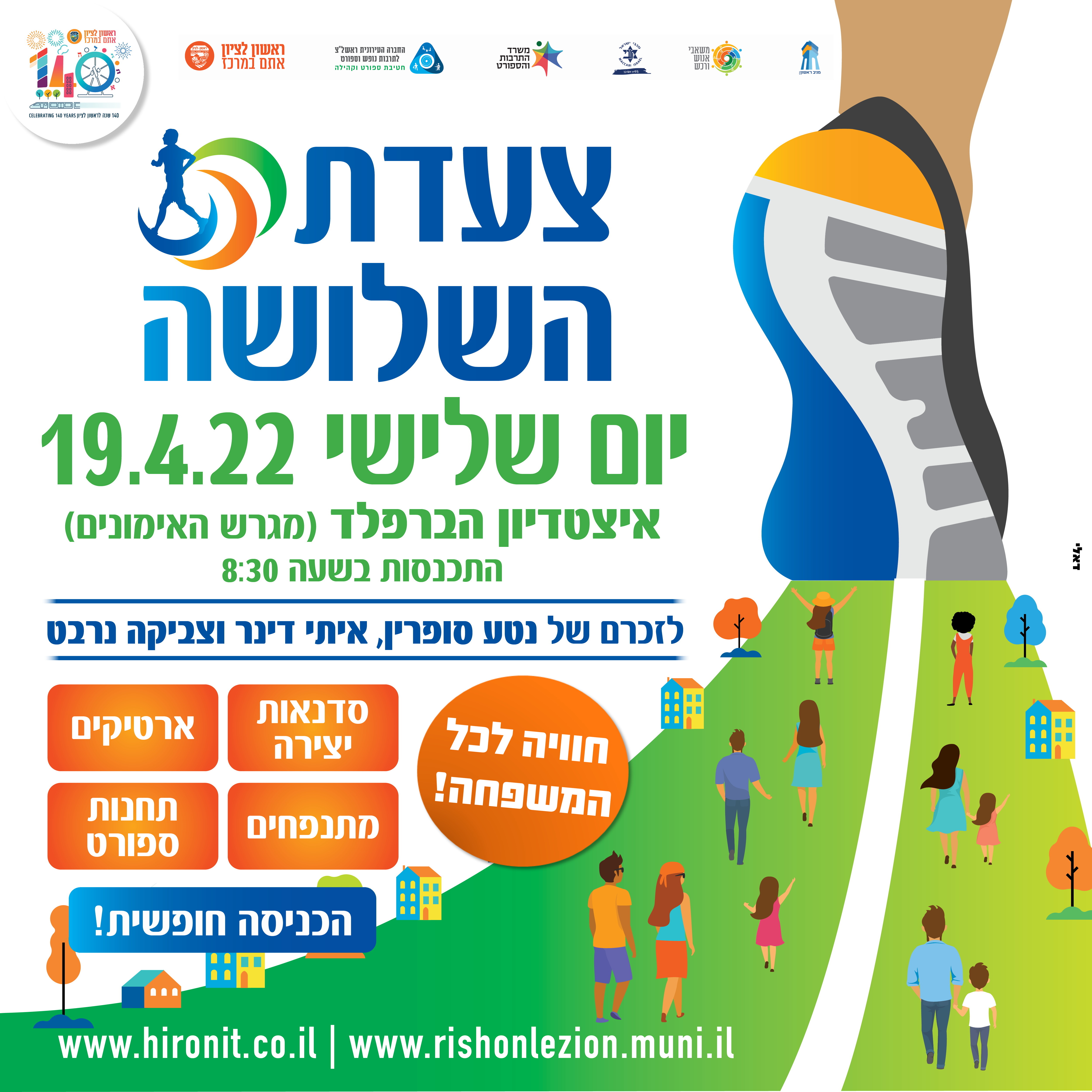 חול המועד פסח, יום שלישי, 19.4 בשעה 08:30 מאצטדיון הברפלד. בוקר חווייתי של צעדה והפנינג עם מגוון פעילויות לכל המשפחה. 🏃♀️🏃 ההשתתפות חינם! אין צורך להירשם מראש. לפרטים נוספים >>