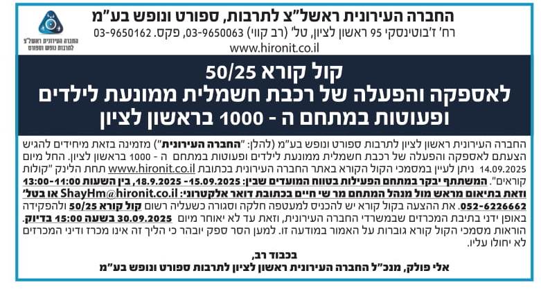 קול קורא 50/25 להפעלת רכבת חשמלית ממונעת במתחם פארק ה 1000 בראשון לציון