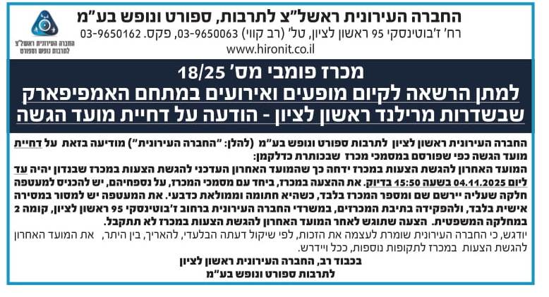 מכרז 18/25 למתן הרשאה לקיום מופעים ואירועים במתחם האמפיפארק שבשדרות מרילנד שבראשון לציון