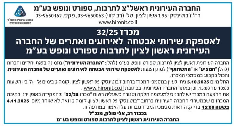 מכרז מס 32/25 לאספקת שירותי אבטחה לאירועים ואתרים של החברה העירונית לתרבות ספורט ונופש ראשון לציון