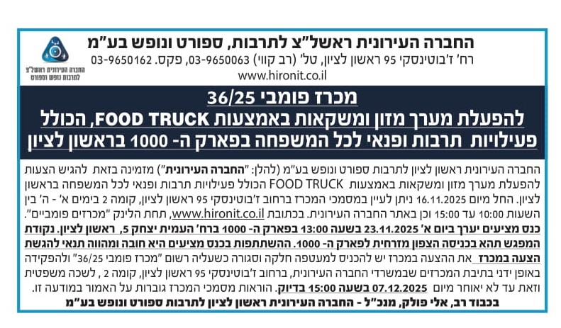 מכרז פומבי מס' 36/25 להפעלת מערך מזון ומשקאות באמצעות FOOD TRUCK הכולל פעילויות תרבות ופנאי לכל המשפחה בפארק ה-1000 בראשון לציון