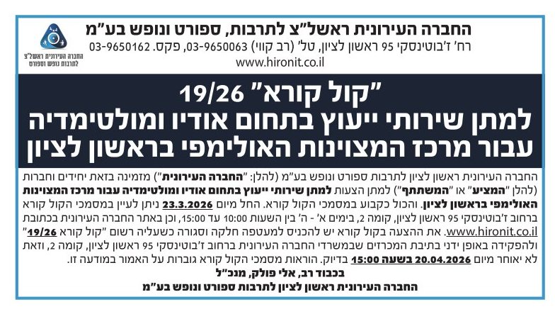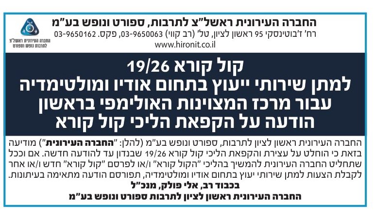 קול קורא 19/26 למתן שירותי ייעוץ בתחום אודיו ומולטימדיה עבור מרכז המצוינות האולימפי בראשון לציון