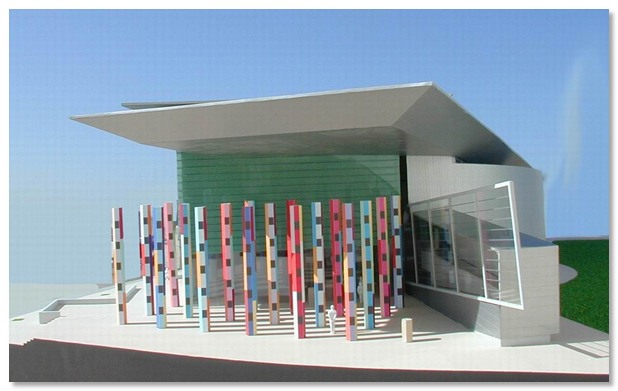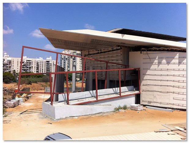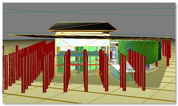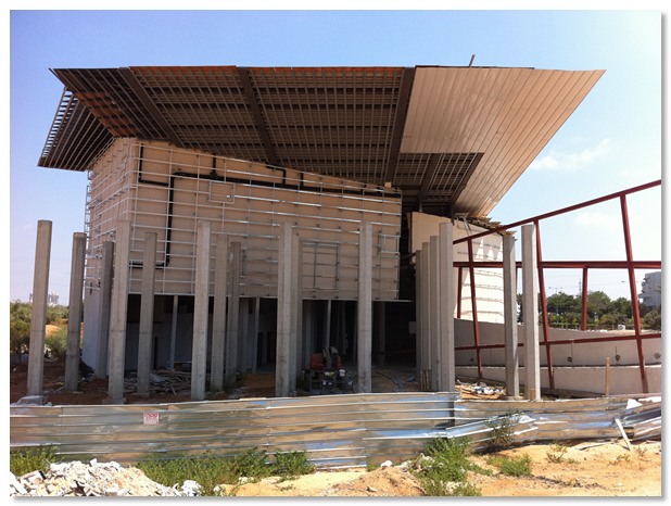 - סילואטה דינמית למבנה זורם ,תוך תנועה אליו ובתוכו. קווים אלכסונים ,תחילתם בקרקע ובשדרת העמודים וסופם בקצה גג עליון אלכסוני.