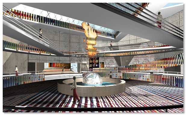 להשלמת החוויה מתוכנן באחד האולמות הראשיים מרכז חוויה המשתמש בכותלי התצוגה וברמפות המטפסות סביבו למופעים סימולטניים. קהל הצופים יהיה במרכז , וסביבו מערכת במות היקפית.