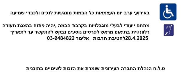 בהתאם להנחיות החירום נדחו כל אירועי העצמאות מיום רביעי בערב 30/4/25 ליום חמישי ה-1.5.25 החל מהשעה 19:00